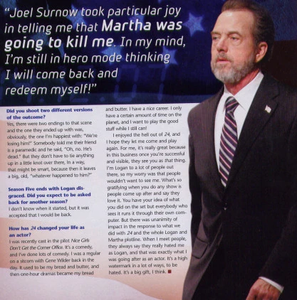 Gregory Itzin, a.k.a. Charles Logan fills the magazine in on how he came back during Season 6, his favourite moments and the dysfunctional life of the Logans! He goes on to talk about the way he exited the show in Season Six, and there's even a short, special section featuring an interview with Jean Smart, who played his on screen ex-wife Martha, in which she talks about the good acting skills of Itzin.