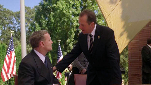 As they considered the possibility, Mike informed him that President Suvarov wanted to talk with him. As he saw him outside, Logan walked out and greeted Suvarov. The Russian President asked him about the delay on the assault, but Logan assured him it would take place before the treaty was signed. Suvarov then reminded him how both of them had staked their political futures on the treaty, and how it would become meaningless and a mockery if the rescue attempt failed. After this, Logan continued his preparations for the summit.