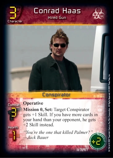 Conrad Haas was an experienced sniper turned mercenary assassin, hired by the Sentox conspirators to take out former President David Palmer during the first minutes of Day 5. Later in the hour, Haas also took out Michelle Dessler, grievously injured Tony Almeida and unsuccessfully targeted Chloe O'Brian -- in order to frame Jack Bauer for the murders and obscure the motive for Palmer's death. Haas was eventually discovered and stopped by Jack, and after confessing to killing Palmer, Jack killed the defenseless assassin.