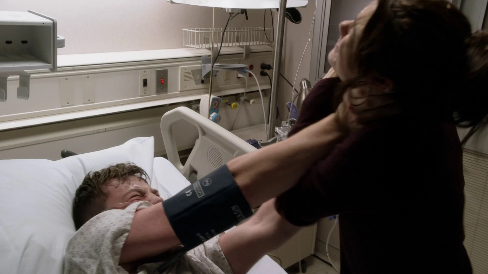 She sniffles, then starts with the syringe. She hesitates, overcome with emotion. Drew suddenly wakes up and panics. She tries to calm him down, but to no avail. As they fight, she breaks away and quickly injects the syringe, killing him. Barely able to control her emotion, she leaves.