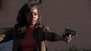 Nicole threatens Aisha who's just getting up, but Aisha doubts she'll do it and gets up and runs away at the sound of police sirens nearby. Jerome follows. As the police pull up, Nicole drops the guns on the ground. They arrest her and put her in the squad car.