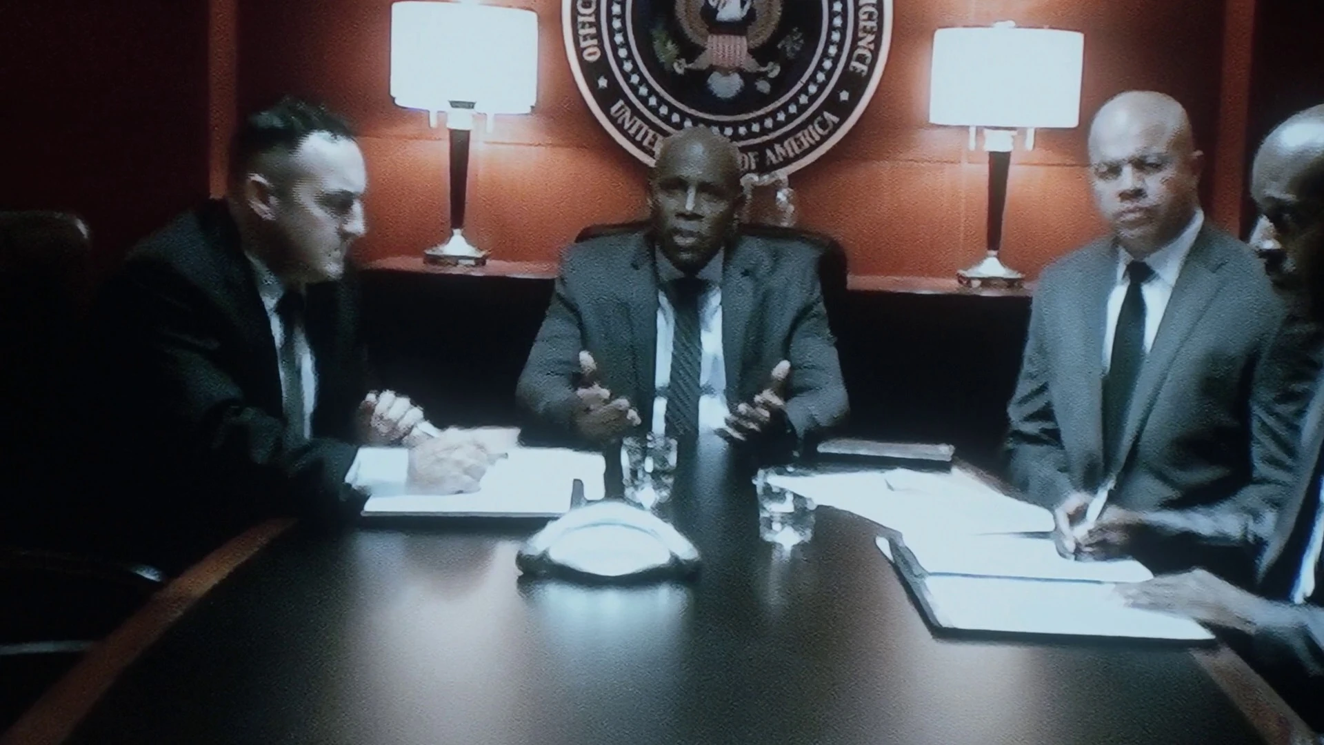 Mullins addresses the Director of National Intelligence and tells him about the approaching terror attacks. The Director asks for a worst case scenario, and Mullins defers to Rebecca, who tells of Bin-Khalid's plan to have 15 to 20 sleeper cells attack the country together, resulting in devastation.