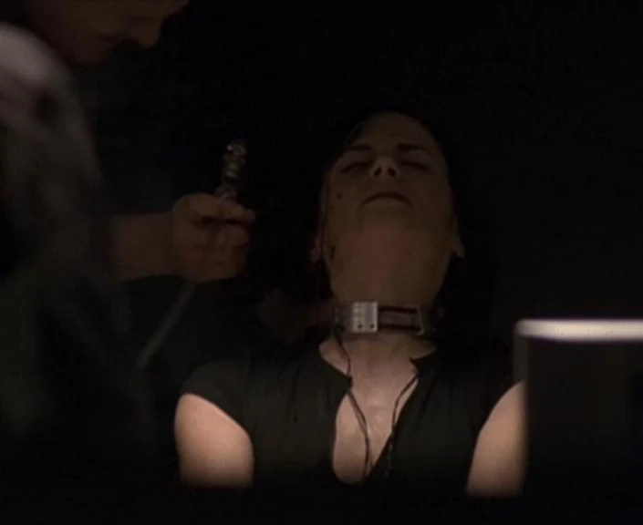 Tony leaves the room, and rejoins Michelle and Dalton. Dalton says that they have nothing so far, and recommends they send her for a passive response test. Tony says that room no. 7 is not secure enough, and asks for Darren Richards. Michelle calls him in. Richards has two briefcases in his hand as he walks into the room. Tony introduces her to him, and Nina says hello. Richards doesn't respond, but instead prepares a syringe.