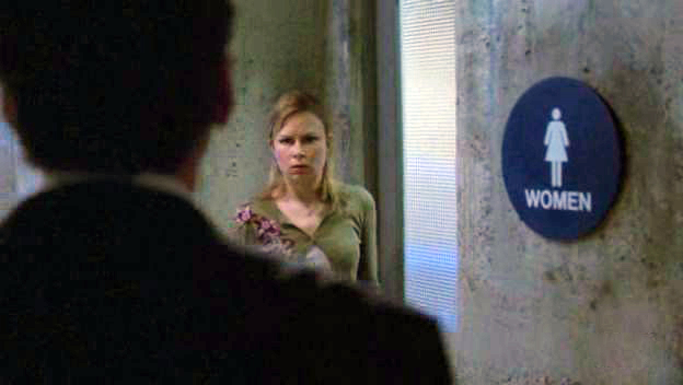 Miles gets to the server room to find no one there. As he is leaving Chloe exits the bathroom. Miles asks her what she did, and Chloe pretends to be disgusted.