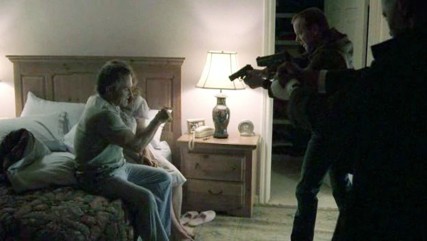 Bauer points his gun to Carl's head and tells him to get down. Bauer throws him to the floor and Carl yells for his wife to call the police. She goes for the phone but Jack runs into the room and stops her. Wayne brings Carl in and Carl gets on his knees. He tells them where the safe is, and Jack informs them they'll be going to the bank. Carl says he doesn't have access, but Jack knows better. Carl refuses to talk until Jack points his gun at the wife, when Carl finally agrees to go with Jack and Wayne. Jack tells Carl to get dressed and grab four neckties—to tie up Carl's wife.
