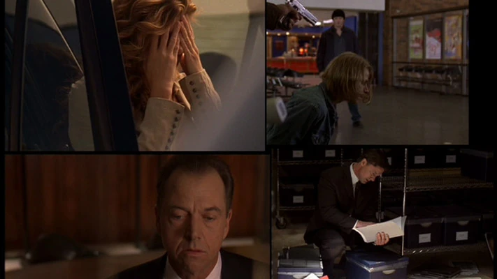 Split screen: Derek is breathing rapidly as he is about to be executed. Diane is crying worried about her son's safety. Charles Logan is in his office worried about the hostages at the airport. Cummings is in the archives room looking for the evidence that will implicate him.