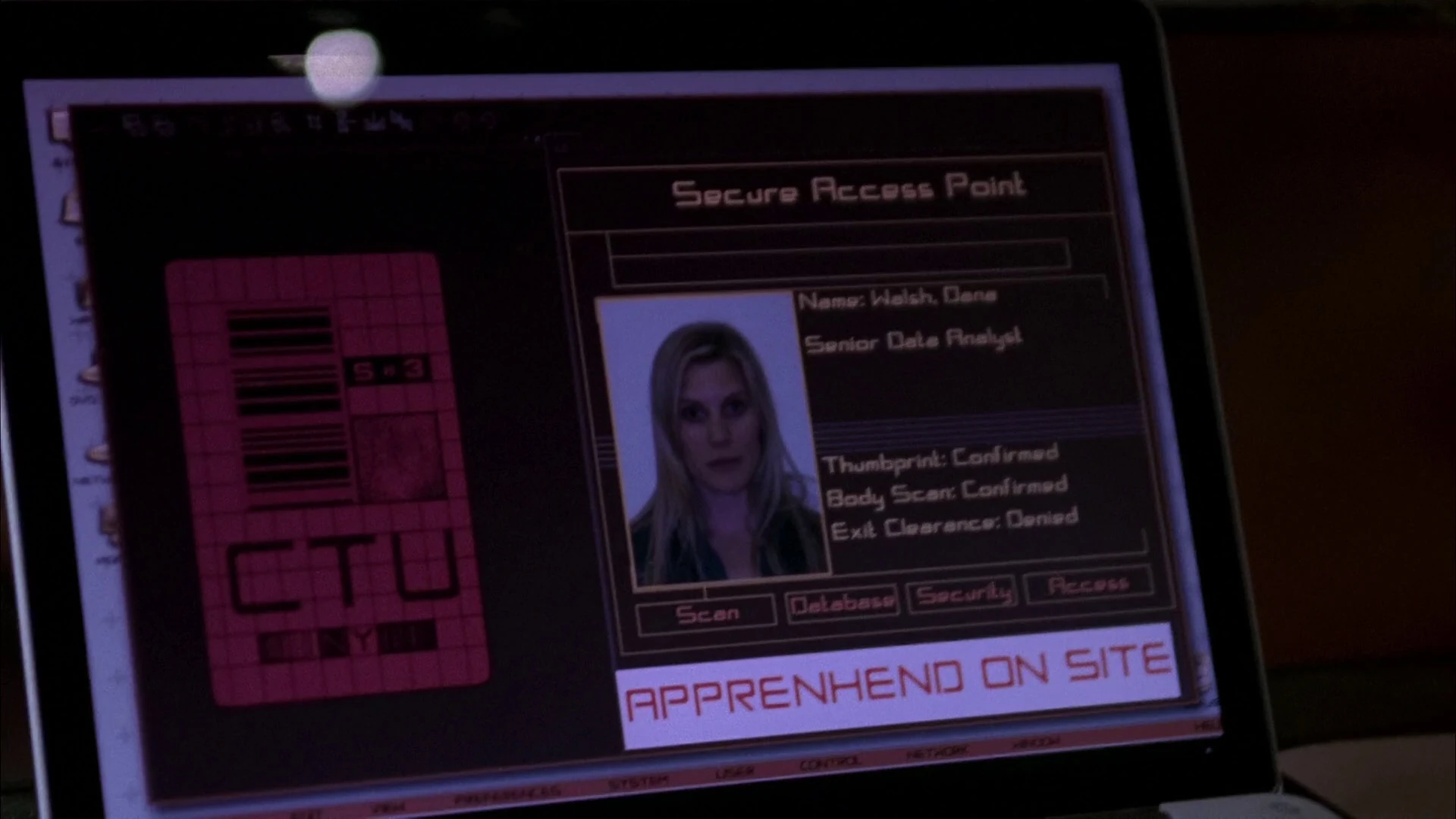 - When Dana's authorization is being verified the second time, the words "apprehend on sight" are mistakenly shown as "apprenhend on site". Her exit clearance is also still shown as "Denied" although it may have reverted after her cover was blown. (Also, since the alert was to be put out as soon as possible, "site" is faster to spell.)