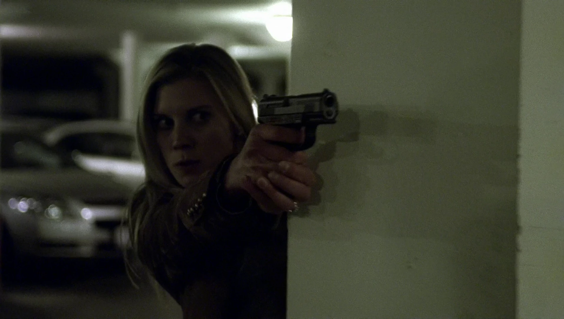 Dana tries to leave again, and the guard scans her pass key. However, he is given an alert to apprehend her on sight. Realizing that she’s been made, she pulls out a pistol and opens fire, killing two guards. She uses an employee as a human shield as she retreats into the parking garage. Cole demands to know why there’s a 112 on Dana, and Hastings tells him that she is a mole working for the terrorists. Watching her on the security cameras, he realizes that she’s going for her car and runs after her. Hastings locks down the exits.