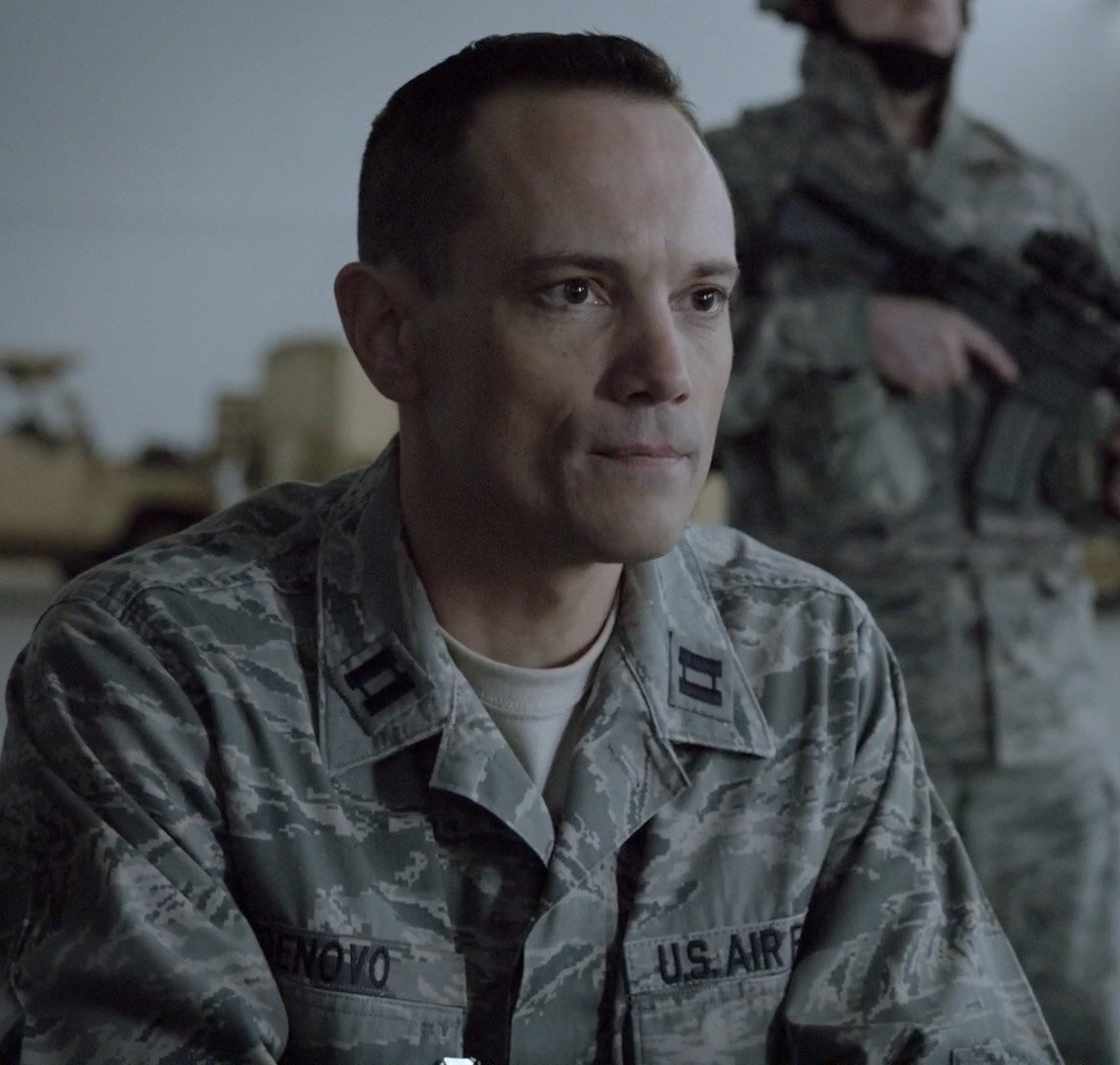 Denovo questioned his subordinate, Chris Tanner, after the latter was arrested for his alleged drone attack on Major Shepherd's convoy in Afghanistan. The captain was unconvinced by Tanner's pleas that he was innocent, as he had found Tanner's postings on a military forum threatening violent action against the major. Furthermore, Denovo said that the logs on Tanner's flight key proved he had fired the drone's missile. Tanner maintained his innocence, swearing that he had been framed by someone else.