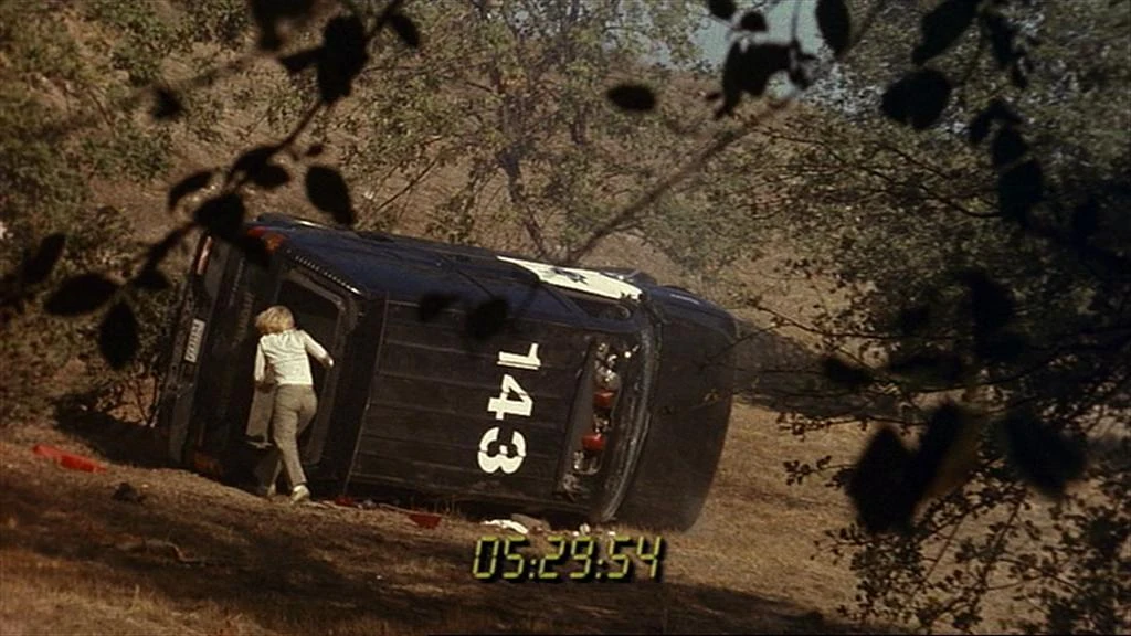 While transporting Kim Bauer and Miguel to Central, CHP officer Raymond Brown drove off the 118 after Miguel started a fire in his car. He crashed near a wooded area of San Fernando, seriously injuring himself and Miguel. Kim radioed in for help, and remained by the vehicle until rescue teams arrived. She then ran off into the Angeles Crest Forest, to avoid being captured and taken back to LA. ("5:00pm-6:00pm", "6:00pm-7:00pm")