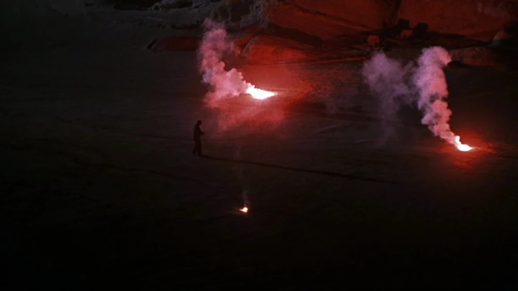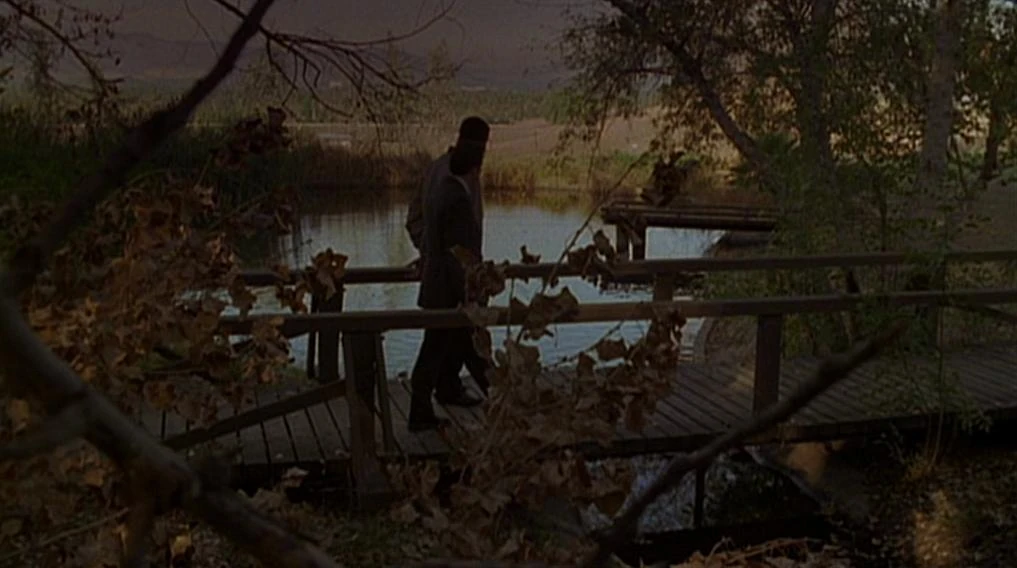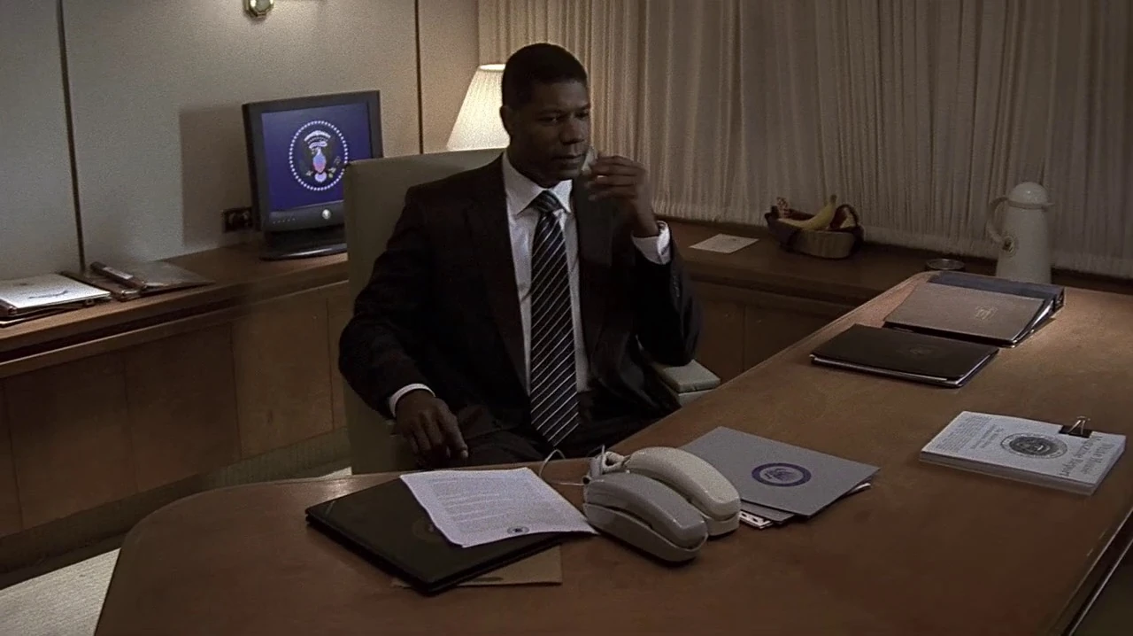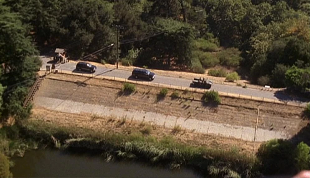 There is an establishing shot of the Oregon presidential retreat which again shows Franklin Canyon Lake with mountains and the retreat added in with digital effects.