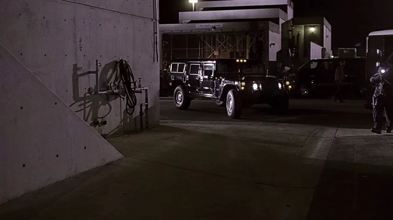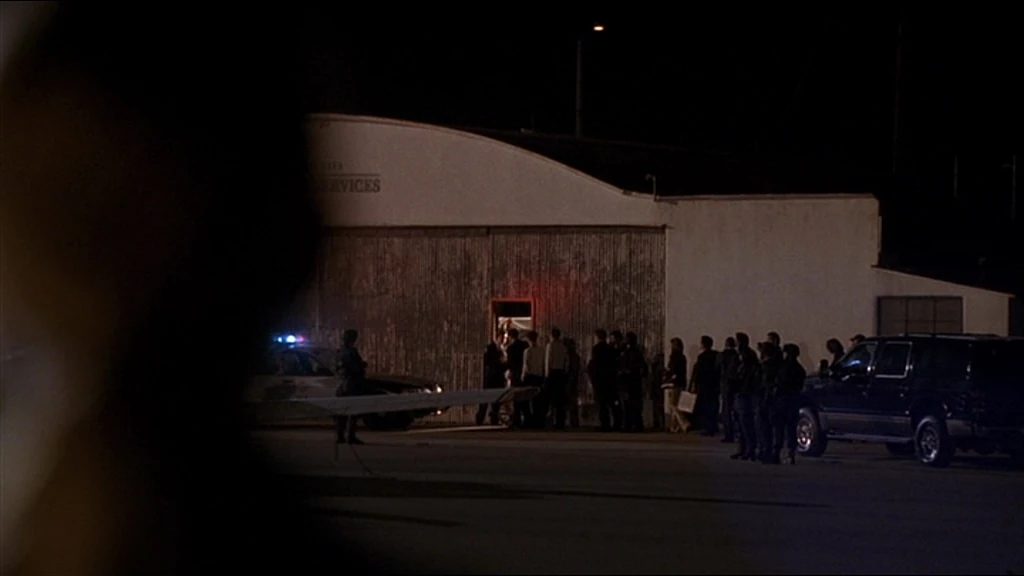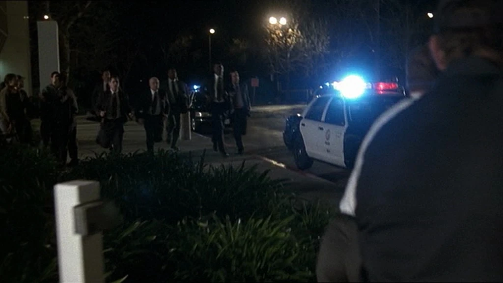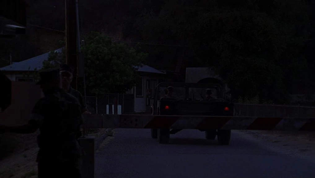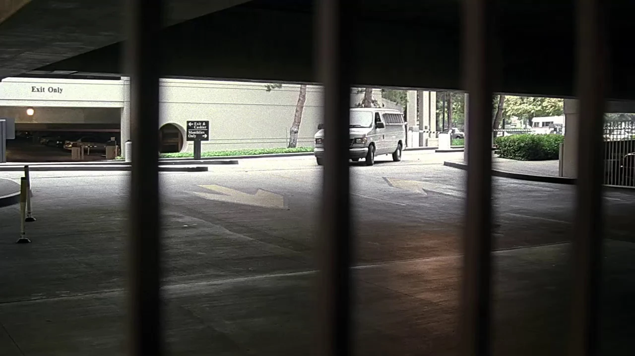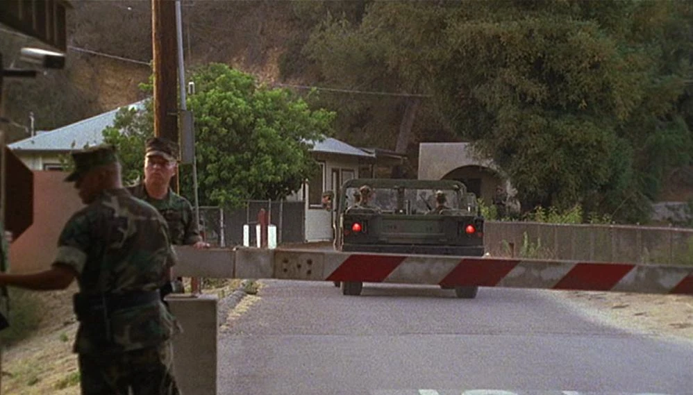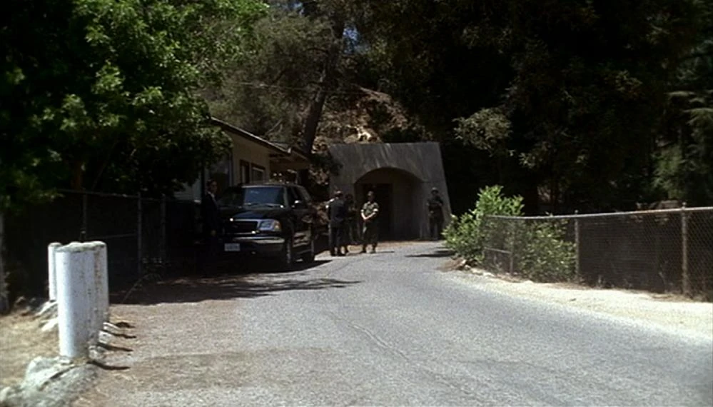 Again the establishing shot of the Northwest Regional Operations Complex shows the doorway built at the end of the stretch of Franklin Canyon Drive by the reservoir.