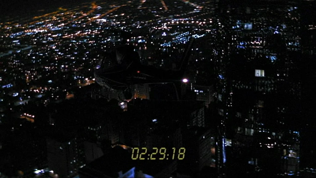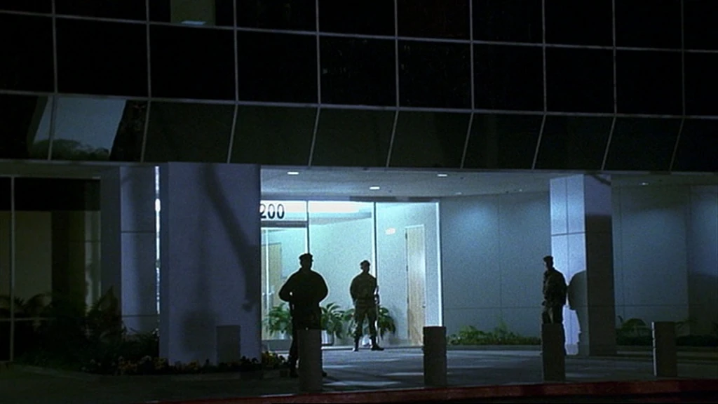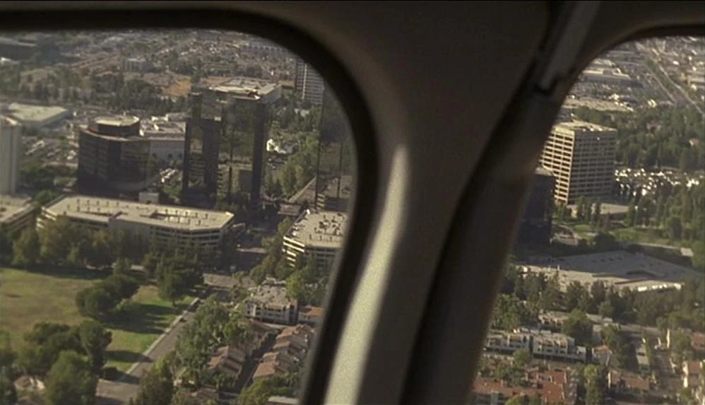When Jack looks out of the helicopter, it is flying east over the intersection of Canoga Avenue with Ventura Freeway. He looks north at the buildings of the Warner Center.