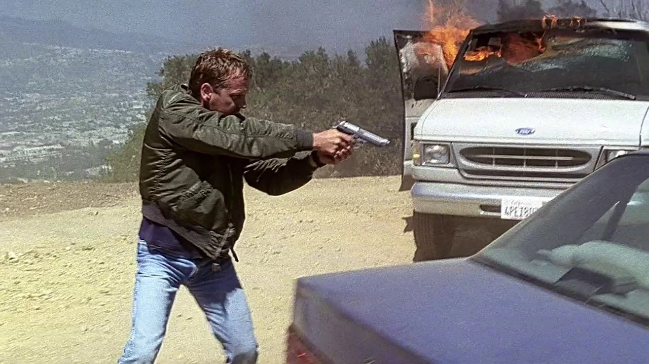 David Palmer is driven down Franklin Canyon Drive, along a stretch that runs next to the reservoir. The 24 team built a barrier at the start of the stretch of road and a fake doorway at the end, that covers the start of a tiny tunnel at the end of the road.