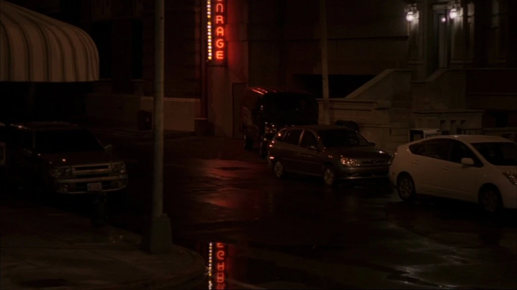 Again the exterior shots of Mark Bishop's apartment are from the New York street section of the Paramount Studios backlot at 5555 Melrose Avenue in Hollywood. The parking garage sign prop was used in Season 2 at the Universal backlot, and is installed here around the corner from the front door where Tom Lennox waits.