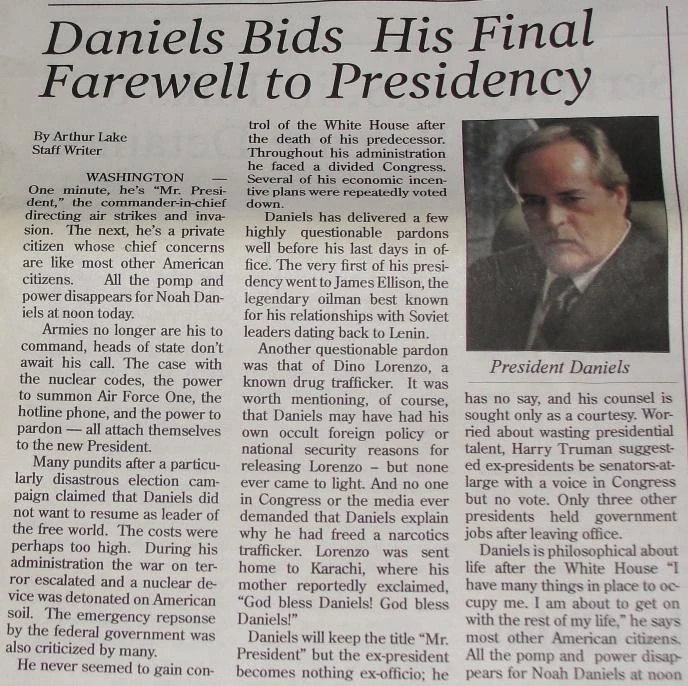 After Wayne returned to the Oval Office, he asked for Vice President Daniels to meet him in his office. Wayne offered his gratitude and appreciation towards Daniels, as his idea of a nuclear attack is what gave him the idea to bluff the ambassador of Fayed's country. However, Wayne felt his and Daniels' political differences would cause further differences in his administration. Wayne asked for Noah to resign as the Vice President. Noah refused to resign, but was forced to comply when Palmer threatened to release Tom's recording. Wayne told Noah that he wanted his resignation within a week.