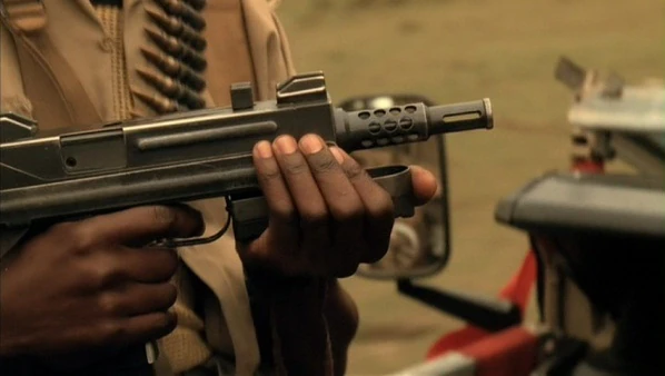 Redemption | One of the rebels that rounded up the boys playing soccer had a Milkor BXP submachine gun. |