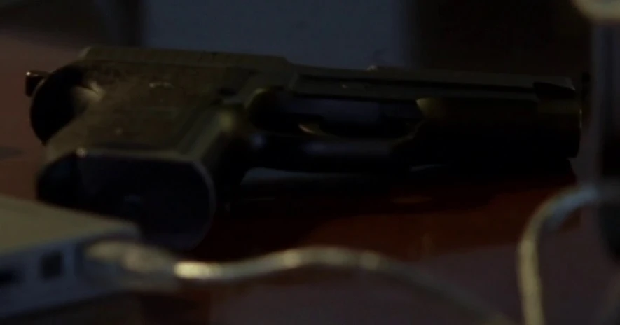 Redemption | Halcott had a SIG Sauer P228 pistol on Chris Whitley's desk when going through his computer, but was never seen using it. |